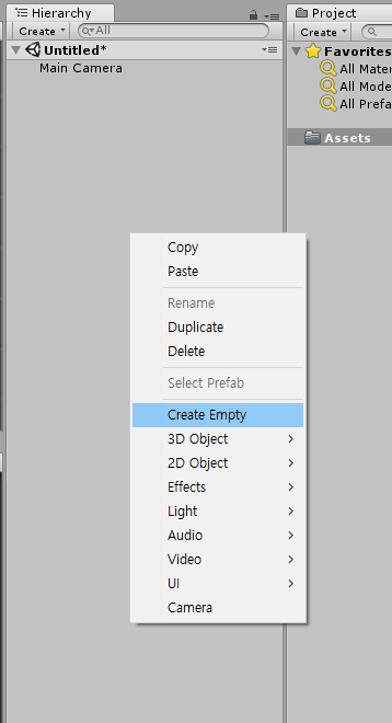 2. Hierarchy 탭에서 마우스 오른쪽 버튼→Create Empty 생성