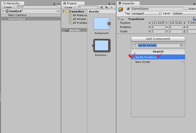 3. 만들어진 빈 오브젝트를 클릭. Add component를 눌러 Sprite Render 검색