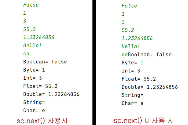 | nextBoolean() | Boolean 자료형 읽음 |