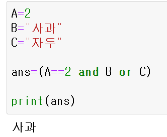 | 변수 = ( 조건 and 조건이 맞을 때 수행 or 조건 아닐 때 수행 ) |