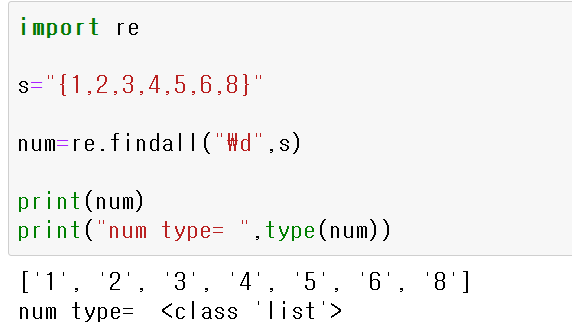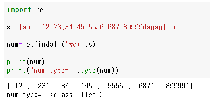 정규표현식에서 제공하는 함수로 해당 함수 괄호 안에 "\d"와 문자열을 넣으면 해당 문자열 안에서 정수만 골라서 출력해준다.