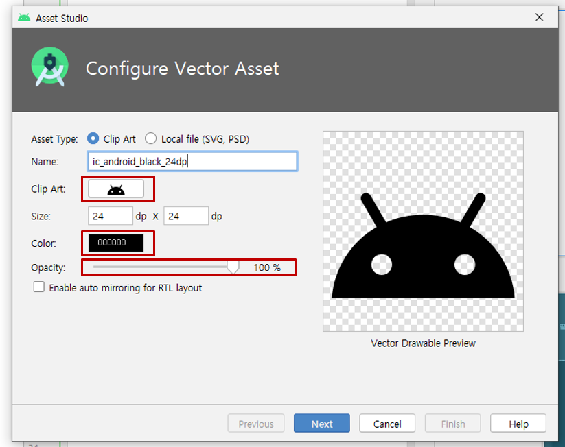 ① res → drawable 왼쪽 클릭 → New → Vector Asset 클릭