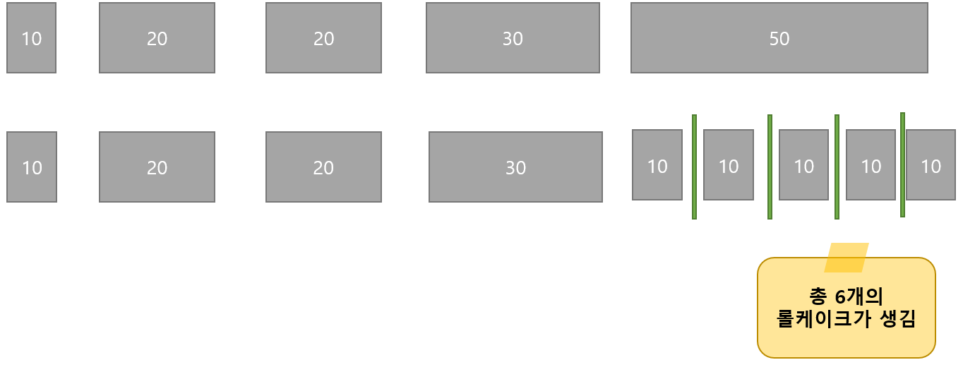 만약 롤케이크의 크기가 10 20 20 30 50 이 있고, 자르는 횟수 제한이 4인 경우