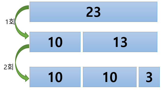 10의 배수가 아닌 23인 경우, 1번 자르면 10 / 13 의 롤케이크가 생기기 때문에 한 번 더 잘라줘야 한다.