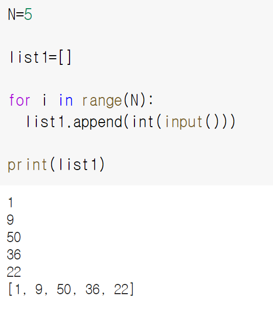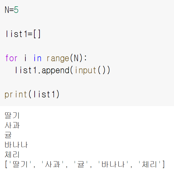 - 엔터로 구분된 여러 개의 문자(혹은 단어) 입력 값을 리스트에 넣는 경우, for문을 사용한다.