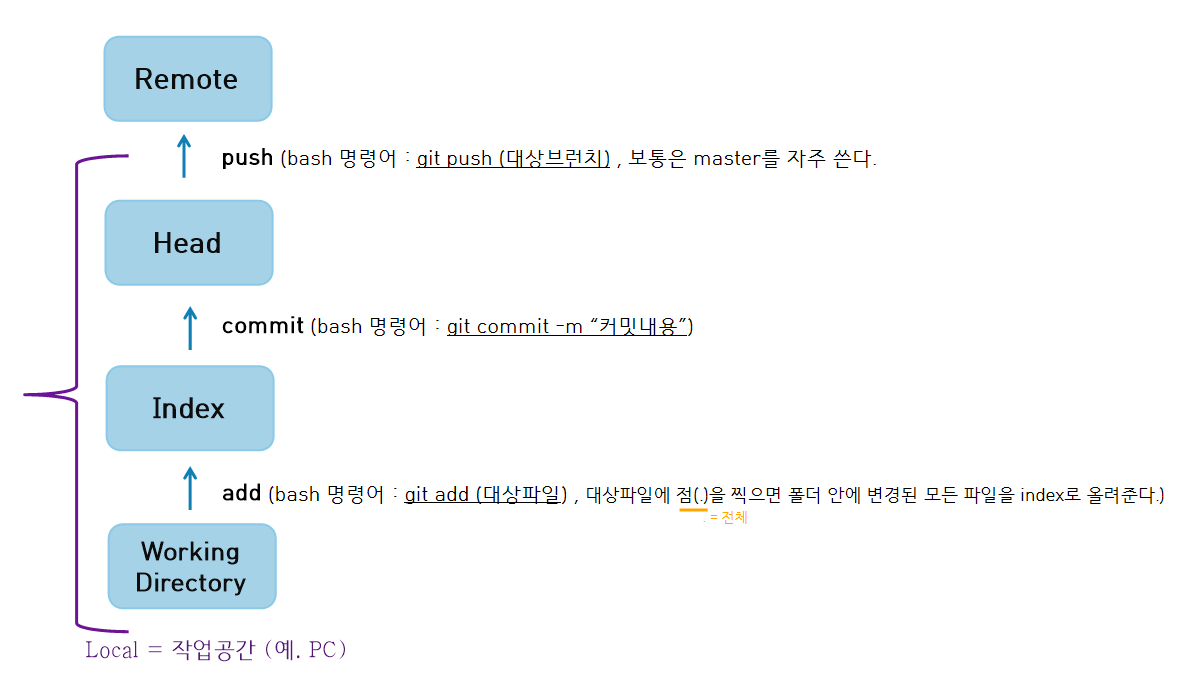 - 원격 저장소인 Remote(예, github)로 push 한다.
