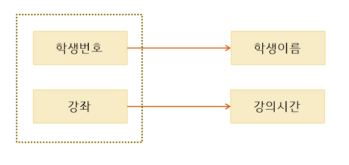 예를 들어 학생번호와 학생이름이 함수 종속성을 가지고 있고 강좌와 강의시간이 함수 종속성을 가지고 있을 때,